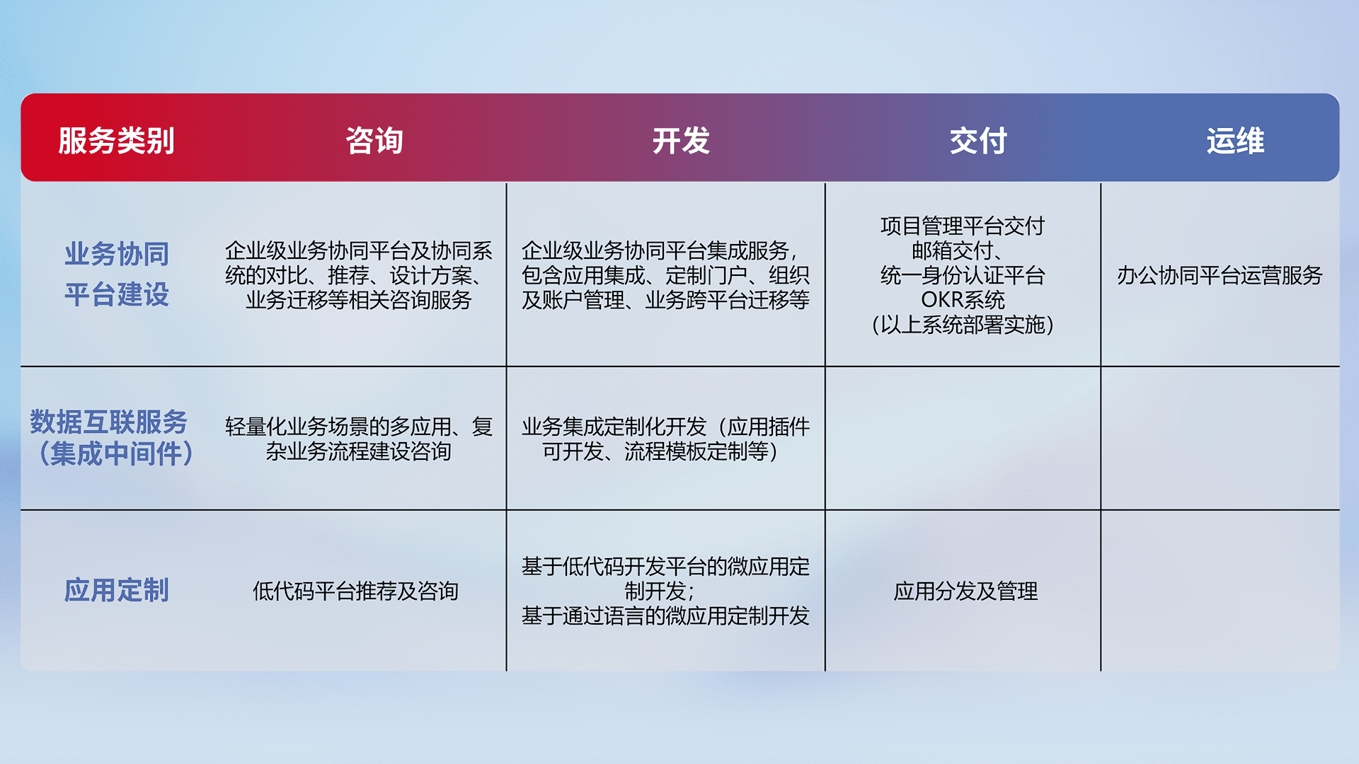 针对钉钉、、、企微、、、IDaas等平台级产品提供产品的规划、、、、方案、、、交付、、、、定制化开发等服务,,实现如统一协同办公、、、、智能客户服务、、混合会议管理、、、智能数据查询、、、、等业务场景,,,实现数字化转型。。。。